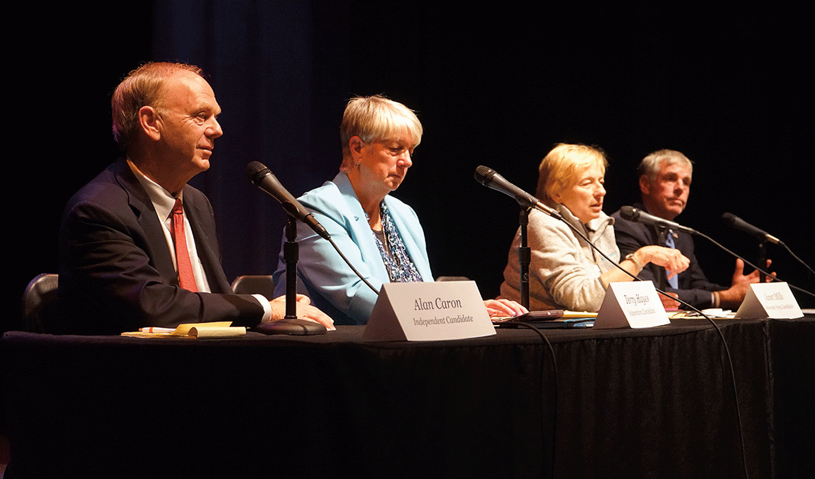 Independents Alan Caron and Terry Hayes were joined by Democrat Janet Mills and Republican Shawn Moody on the stage of The Strand theater, fielding questions about offshore wind turbines, access to working waterfront, the commissioner of Marine Resources, and right whales.